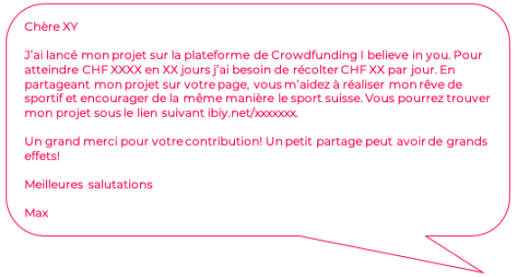 Une fois les 10% atteint, toutes tes connaissances, même les plus éloignées doivent savoir que tu lances ton projet sur ibelieveinyou.ch/fr! Tu dois utiliser tous les outils de communication que tu as à disposition pour informer sur le début de ta campagne.