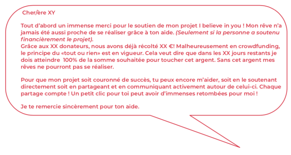 Comment vas-tu ? Je voulais t'annoncer la grande nouvelle : ma campagne de financement participatif sur I Believe In You est maintenant en ligne ! Le but est de m'aider à financer mon projet XX que je ne peux malheureusement pas atteindre seul(e)... Tous les dons, même petits sont d'une grande aide pour moi !