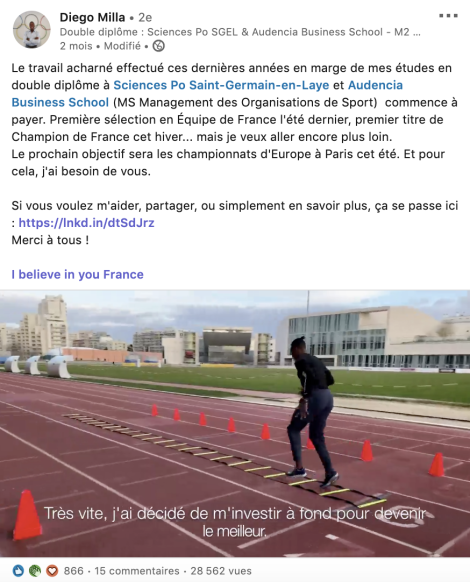 Fais des publications dans des groupes et/ou sur des pages spécifiques : communauté officielle de ton club/ton équipe, groupe de discussion entre passionné.es de ton sport, page de fans d'un.e sportif.ve de haut niveau, etc... Tu peux ainsi attirer l'attention de nouvelles personnes. Ton message peut ressembler à cet exemple :